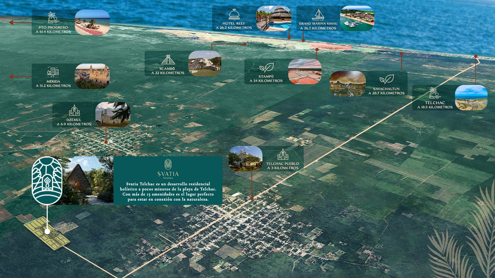 SVATIA se encuentra en Pueblo Telchac, una de las zonas con mayor proyección de crecimiento en Yucatán. A tan solo 10 minutos de la playa y cerca de la zona arqueológica de Xcambó, este desarrollo te conecta con tranquilidad, naturaleza y una ubicación estratégica.